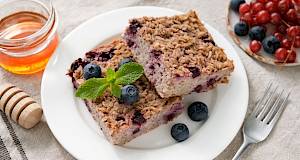 - Pecite – smjesu ravnomjerno rasporedite u pripremljenu posudu, po vrhu posipajte preostalo bobičasto voće i pecite 30-35 minuta, dok ne dobije zlatno-smeđu boju.