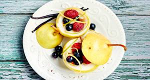 - Kruške posložite na pladanj ili tanjur i napunite s nadjevom. Ukrasite s orašastim plodovima, štapićima cimeta, bobičastim voćem ili po želji.