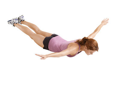 Lezite na pod okrenuti licem prema dolje i raširenih ruku u visini ramena. Pritisnite lopatice zajedno i podignite ruke, torzo i noge od poda. Zadržite se u tom položaju, stavite ruke ispred sebe, zadržite ih, a zatim vratite u početni položaj. To je jedno ponavljanje. Ponovite 10 do 15 puta.
