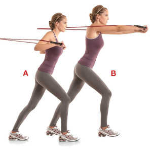 Primite gumu u visini grudi. Iskoračite naprijed. Ruke trebaju biti na prsima (A). Povucite gumu s obje ruke u isto vrijeme (B). Vratite se polako, pazite da ne stavljate ruke iza ramena. To je jedno ponavljanje. Ponovite vježbu 12 do 15 puta.