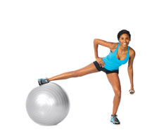 Stanite uspravno, a desnu nogu stavite na loptu. U lijevoj ruci držite uteg. Savijte lijevo koljeno u čučanj (kao što je prikazano). Vratite se na početak i ponovite. Ponovite vježbu i na suprotnoj strani.